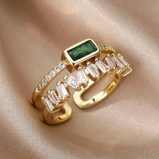 Double Layer Zircon Rings for Women Luxury Open Stainless Steel Ring Green Crystal Couple Jewelry Valentines Day Gift Anillos